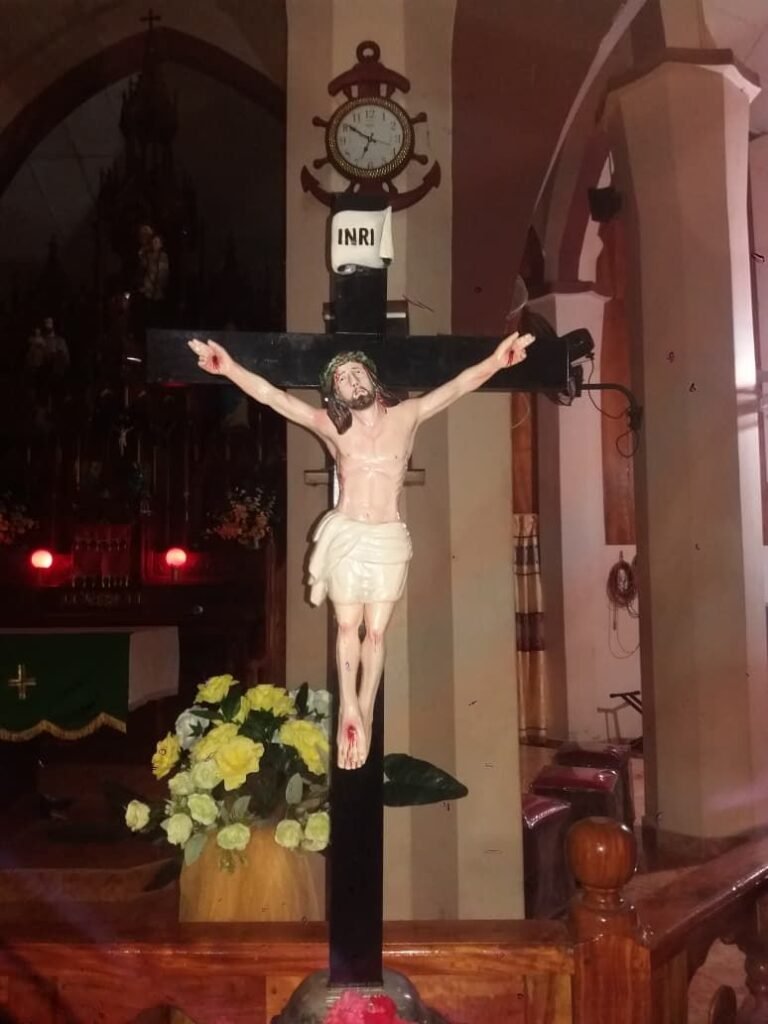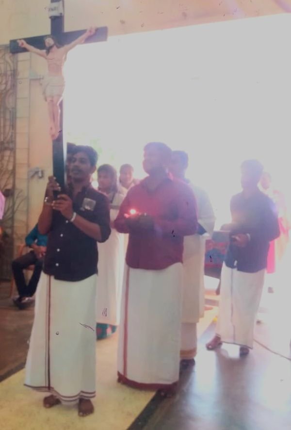 பங்குத்தந்தை எம். நிக்சன் கொலின் அடிகளாரின் தலைமையில் திருப்பலி ஒப்புக்கொடுக்கப்பட்டதுடன் திருப்பலியின் வருகைப்பாடலுடன் சிலுவையில் தொங்கும் கிறீஸ்துவின் திருவுருவம் பவனியாக கொண்டுவரப்பட்டு நிறுவப்பட்டது.